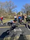 På græsset ligger tasker, festivalstole og tomme ølflasker spredt rundt. Nogle sidder i stolene og følger træningen, mens andre står tæt ved søbredden for at se, hvordan det går. Fra en Soundboks spiller statskundskabssangen, og flere på holdet nynner med, mens endnu en deltager gør sig klar til sin tur.