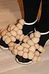 Til lyden af klassisk musik arbejder Marianne i sit værksted. Hun klipper hul i nylonstrømperne og stopper dem omhyggeligt med fyld. Synålen former de små, bløde bolde, der ligner æg.