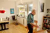 Bendt møver sig op af lænestolen og går ud og åbner døren. Lise og rollatoren ruller ind i lejligheden, mens Bendt sætter sig tilbage i lænestolen.
