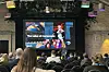 Indenfor er det varmt. For varmt. Folk står tæt i forhallen, taler i munden på hinanden, hænger jakker fra sig og leder efter kaffe. Et par små skærme over baren kører i loop med klip fra dagens oplæg. Der er to scener. En stor og en mindre.