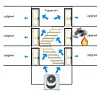 Illustrationen herunder viser, hvordan systemet fungerer i praksis. Nederst i trappeopgangen ses ventilatoren, som sender luft op gennem etagerne. De blå pile angiver luftstrømmen og viser hvordan røg forhindres i at trænge ind fra lejlighederne. Overtrykket i trappeopgangen presser røgen tilbage og skaber en røgfri zone, som gør det muligt at evakuere sikkert.