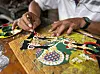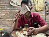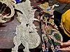 While carving, the texture of the leather becomes especially pronounced. As the pointed hammer strikes its surface, the material gradually loses its pale, faded beige tone, transforming into a brighter cream colour. Once the carving is complete, sandpaper is used to prepare the leather, allowing it to better absorb pigment. The colouring process follows, with four types of natural pigments applied to both the front and back of the puppet. Gold, bronze, blue, and black - the main colours - are derived from tree resin and mixed with other natural substances, such as turmeric. Finally, a preserving compound is applied to protect the finished work and ensure its longevity.