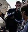 I kontrast til den røde vest er der ikke en rød plet at spotte på hans kinder.