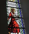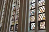 Lyset står ind gennem de farvede ruder og lægger sig i bløde felter hen over kirkebænkene. De kaster røde, blå og gyldne skygger over træet og støvet danser i striberne af lys.