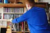 Massevis af vinyler og cd’er fylder hylderne ud, og den hjemmebyggede stige gør det nemt for Edd Freiesleben at nå hele samlingen.