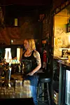 Hun skænker absint og Fernet Branca op og langer øl over disken. Væggene er dækket med billeder af kranier, og hver overflade er plastret til med klistermærker fra forskellige rockbands. Den ene Marlboro One bliver tændt efter den anden, alt imens at hun får tiden til at gå ved at snakke med stamgæsterne på barstolene. Klientellet er oftest ældre end hende, oftest mænd, men her synes hun selv, at hun hører til. Rockmusikken summer fra højtalerne, og verdenssituationen bliver vendt.