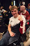 Next up is Dawid. He’s from Poland and competes in the 70-kilo class.All seems normal, but he takes some time to come to the stage after he’s called up. Finally, he comes on crutches. He struggles to get up the three