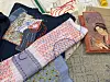 En regnbuefarvet bunke af stoflapper ligger på midten af bordet. Mørkeblå velour mikset sammen med stykker af tynd hamp og kanter med fine blonder. Nogle lapper har kaffepletter, brændte kanter, eller er slidt op til at være halvt-gennemsigtige. Andre er så tykke som gulvtæpper.