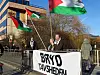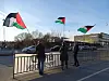 ”I dag er der lidt mandefald”, siger Ulstrup, mens han peger på Michael Fehsenfeld og Mette Kristensen, de to andre, der er mødt op. Han fortæller, hvordan de i starten blot stod ganske få ude ved Ringvejen. Siden er der kommet så mange til, at man nu kan støde på de livlige farver i det palæstinensiske flag seks forskellige steder i byen.