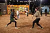 Spredt latter og smalltalk om tandlægebesøg og historisk tøj, der passer til gravide, bliver afbrudt, da de to hold stiller sig op på linje i hver deres ende af banen.
