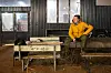 Ved skruetvingen høvler et af medlemmerne på sit spyd inden træningen. Træspåner ligger spredt ud over gulvet, mens lugten af brænderøg blandes med duften af harpiks.