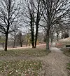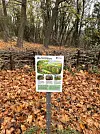 Vejarbejdet summer i baggrunden. Når man først træder ind, bliver man mødt af et skævt skilt. Den indeholder information om haven, som blev indviet den 12. april 2025.