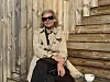 Solbriller for øjnene, de lyse krøller i en hårklemme og en moderigtig trenchcoat.