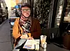 Den lange, brune jakke og tørklædet giver varme i forårssolen, mens hans brune hat kaster skygger over panden. Blikket er roligt og nærværende, skuldrene sænkede.
