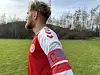 Han har den velkendte røde landsholdstrøje på, stiller sig op foran kamerastativet og starter optagelsen. Pludselig er de tomme fodboldbaner omringet af 32.257 fans, der alle har fokus på Khaled.