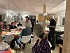 Signe, Solveig og Laila er på dagens madhold, og resultatet af deres arbejde spreder sig. En velkommende duft af lasagne. To fade med kyllingelasagne og en vegetarversion med svampe står klar på bordet. Folk er ved at finde deres pladser – ikke ved de sædvanlige borde men ved dem som nummertrækningen har tildelt dem.