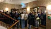 Folk bliver stående. Andre bevæger sig rundt mellem hinanden. Snakken fortsætter i rummet ved siden af Aulaen, hvor højborde står tæt.