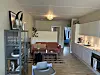 I spiseområdet ved vinduet står en lilla børnestol klemt ind mellem de brune læderstole. Ved siden af står et sort glasbarskab med champagneglas, whiskyglas og en flaske Jägermeister på nederste hylde. Altandøren fungerer som lejlighedens primære lysindfald, og den kolde marts-sol ligger som et lag hen over gulvtæppet under bordet.