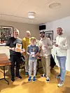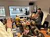 Michael Løhde træder frem mellem bordene og rækker trofæet frem til vinderen, mens de andre deltagere samler sig omkring bordet og hylder de 4 finalister.