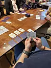 Pludselig må spilarrangør og -designer, Michael Løhde blæse i fløjten. De uofficielle danmarksmesterskab har ikke overholdt den officelle tidsplan, og der står nu to ivrige deltagere der ikke har fået plads ved bordende. Det gik ellers lige op. Tre spillere ved hvert bord, nu måtte der laves to fire-mands bord og to tre-mands borde.