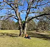 Der er noget næsten symbolsk over den plads, Sara Juhl har valgt denne forårsdag i Aarhus. Midt i parken, hvor det åbne græs strækker sig mellem de høje træer, har hun sat sig op ad stammen af et gammelt bøgetræ.