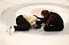 Suddenly—a bang, and Aleksandra falls. She covers her ears with her hands. Barbora rushes to her side. Aleksandra is lying on the ice in a fetal position. The world is gone, and the war is back.