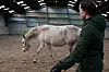 After she feeds the horses and cleans their living quarters, she goes to work with Pony. She trains her to come to her if she is anxious, to breathe deep and relax, to be calm when being touched. Riding is off the question; now it’s just about emotional regulation. Aleksandra holds out her hand near Pony’s cheek and signals her to touch. Pony takes her time but eventually touches Aleksandra’s hand with her face. To which she is awarded with a treat and a dygtig, Pony!