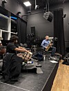 Lyden af saxofon og indiske tablaer i samme rum